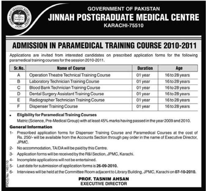 Admissions Open in Jinnah Postgraduate Medical Center Karachi Read newspaper ad for exact details.