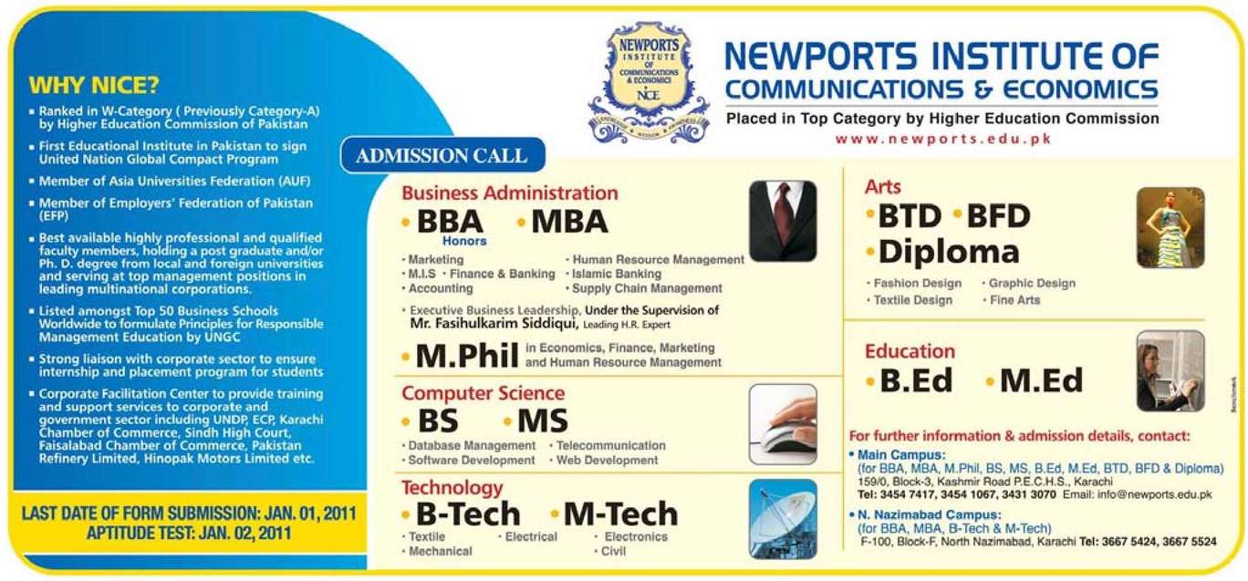 Admissions in MBA,BBA,M.PHil etc.in NEWPORTS Institute of Communications & Economics Karachi Read newspaper ad for exact details.
