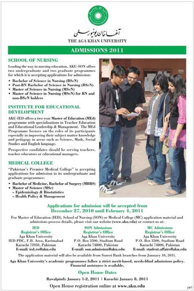 Admissions MBBS,MS etc in Agha Khan University Karachi Read newspaper ad for exact details.