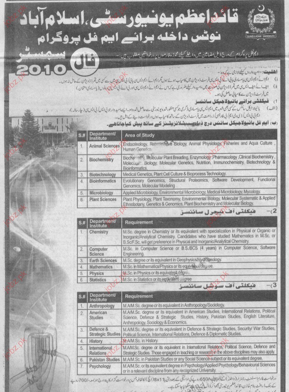 M.Phil Program Admissions Open In Quad-e-Azam University Islamabad Read newspaper ad for exact details.