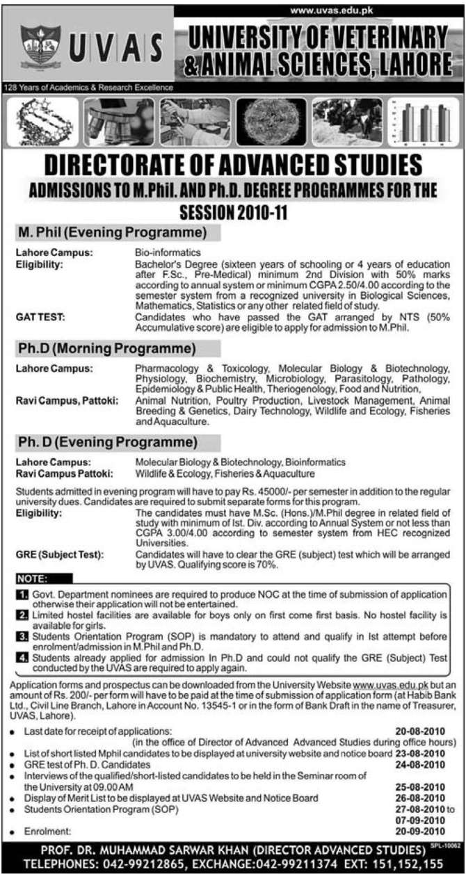 Admissions Open in University Of Veterinary & Animal Sciences Lahore Read newspaper ad for exact details.