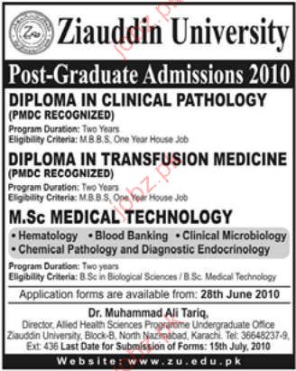 Diploma in Clinical Pathology/ Transfusion Medicine and M.Sc Medical Technology Admissions Open in Ziauddin University Karachi Read newspaper ad for exact details.