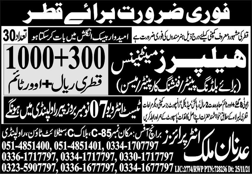 Adnan Malik Enterprises is looking for candidates for following posts as per job advertisement published in daily Express Newspaper of November 5, 2022 for location Qatar, qatar Qatar: