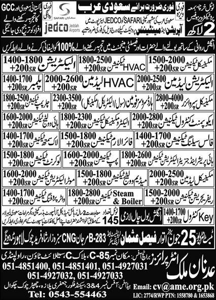 Adnan Malik Enterprises jobs advertisement dated about 24 June 2023 in daily Express Newspaper invites application for the vacant post of mechanical leadman, electrician leadman, electro mechanical technician, plumber, hvac technician, medium voltage technician, high voltage technician, motor electrician technician, chiller pump technician, equipment control technician, mechanical technician, high pressure generator electrician technician, locksmith technician, hvac leadman, hard services foreman, steam boiler technician, water proofing technician, mechanical supervisor, low current technician, false ceiling technician, fire alarm technician, pump technician, electrician, refrigeration technician and key control in Riyadh, riyadh Saudi Arabia. Intermediate, Middle and Matric etc. educational qualification will be preferred.
