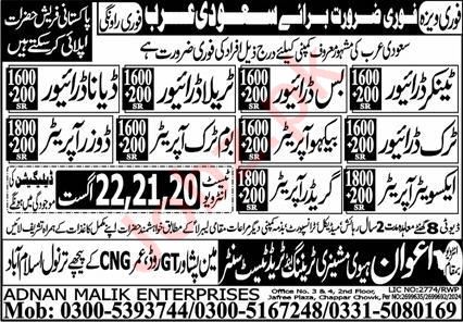 Adnan Malik Enterprises is looking for candidates for following posts as per job advertisement published in daily Express Newspaper of August 19, 2024 for location Riyadh, riyadh Saudi Arabia: