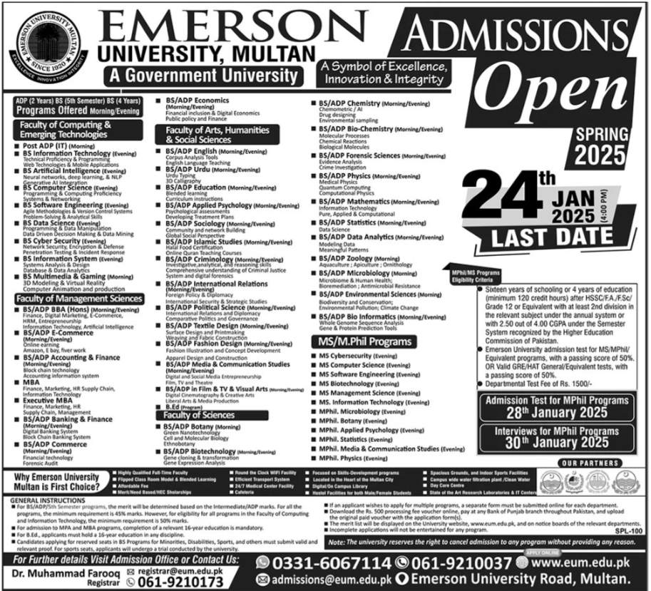 Emerson University Multan ADP admissions 2025 has been started. Students who want to take admissions in Emerson University Multan Multan Punjab Pakistan for academic year 2025 to continue education in Science University can apply. Eligible students for fulfilling criteria for admissions in can enroll as per Private admission policy 2025 till closing date. Read newspaper ad for exact details.