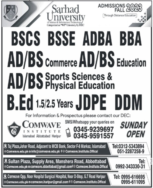 Sarhad University of Science & Information Technology admissions 2023 for BSCS, BSSE, ADBA, BBA, ADP, B.Ed, JDPE, DDM has been announced. Sarhad University of Science & Information Technology Islamabad Abbottabad and Haripur Islamabad Pakistan welcomes students to apply for admissions in academic year 2023 in Science University. Eligible candidates for admissions in BCS, BS, ADP and BBA can apply as per Private institute criteria and before closing date 29 November 2023 after reading advertisement online. Read newspaper ad for exact details.