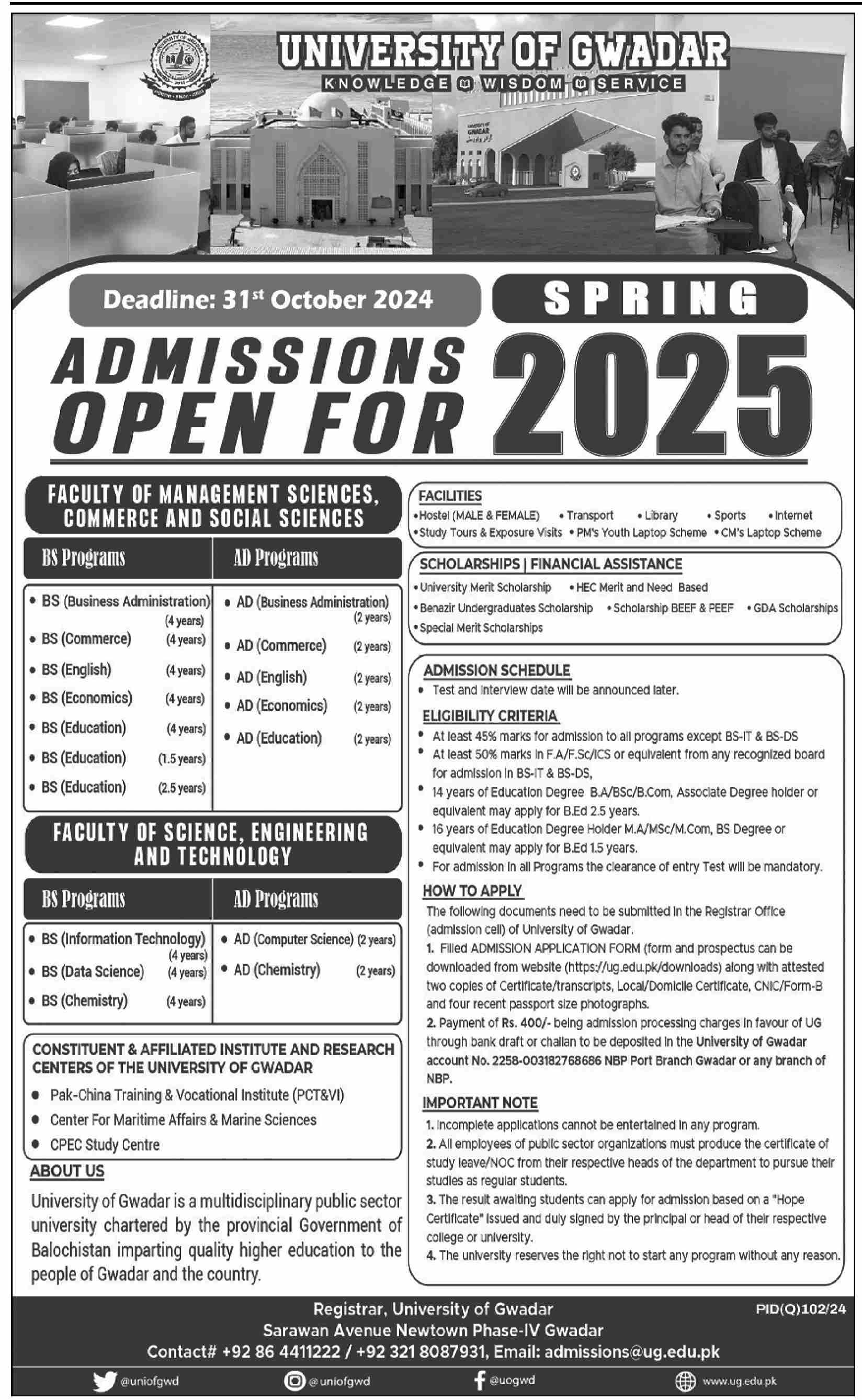 University Of Gwadar admissions 2024 for ADP Programs, BS Programs has been announced. University Of Gwadar Gwadar Balochistan Pakistan welcomes students to apply for admissions in academic year 2024 in Science University. Students for admissions in ADP and BS can apply for online or campus classes as per Government institute criteria till admission closing date September 30, 2024. Read newspaper ad for exact details.