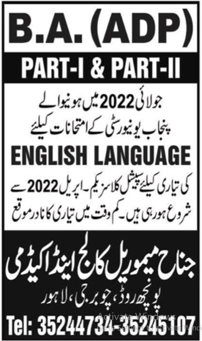 Jinnah Memorial College and Academy admissions 2022 for ADP, BA, English Language Preparatory Classes has been announced. Eligible students can apply for academic admissions 2022 in Jinnah Memorial College and Academy Lahore Punjab Pakistan for Management College. Eligible candidates for admissions in Course, BA and ADP can apply as per Private institute criteria and before closing date 31 March 2022 after reading advertisement online. Read newspaper ad for exact details.