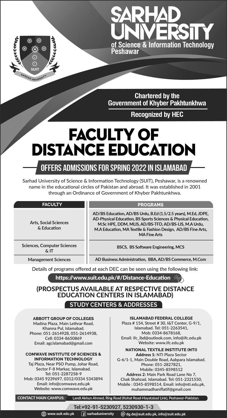 Admissions in Sarhad University of Science & Information Technology 2022 for ADP, BS, B.Ed, MSc, DDM, MLIS, BS TFD, BS LIS, MA, BSCS, MCS, BBA, M.Com has been announced. Students can enroll for admissions in Sarhad University of Science & Information Technology Islamabad Islamabad Pakistan for academic year 2022 to continue campus based or online education in Science University. Eligible students for fulfilling criteria for admissions in M.com, ADP, B.ed, BCS, M.sc, MCS, MA, BLIS, BS, MLIS, BBA and Bachelor can enroll as per Private admission policy 2022 till closing date 6 April 2022. Read newspaper ad for exact details.