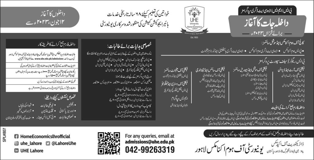University of Home Economics has announced admissions 2023 for Associate Degree Programs ADP, BS Programs, MS Programs. Students who want to take admissions in University of Home Economics Lahore Punjab Pakistan for academic year 2023 to continue education in Science University can apply. Students for admissions in ADP, Bachelor, BS, Master and MS can apply for online or campus classes as per Government institute criteria till admission closing date July 7, 2023. Read newspaper ad for exact details.