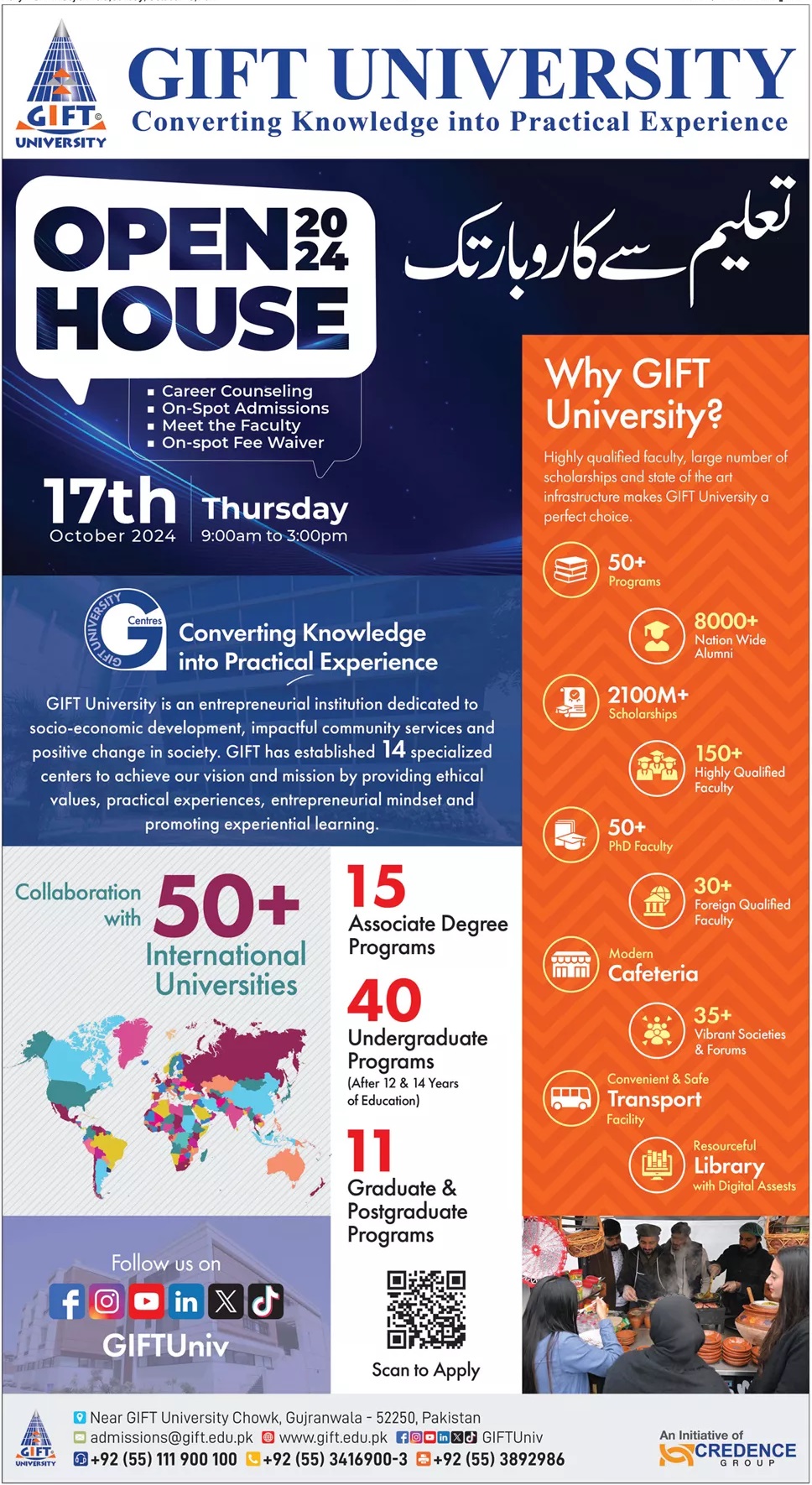 Gift University ADP, BS, MS admissions 2024 has been announced. Eligible students can apply for academic admissions 2024 in Gift University Gujranwala Punjab Pakistan for Science University. Students who want to enroll for academic session 2024 in MS, BS and ADP qualification and admission criteria for Private institute can apply till last date 31 October 2024. Read newspaper ad for exact details.
