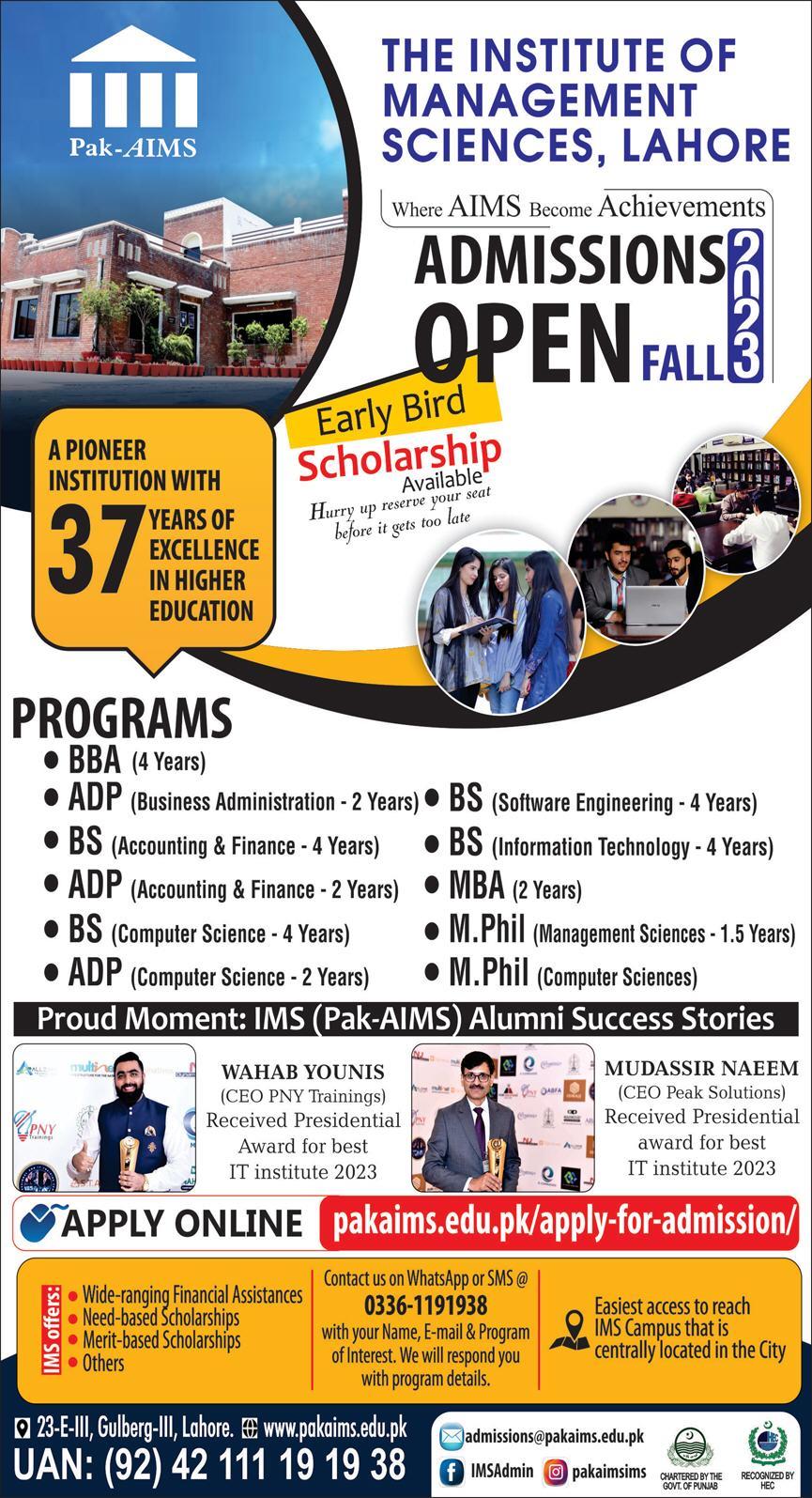 The Institute of management sciences admissions 2023 for BBA, ADP, BS, MBA, MPhil has been announced. Students who want to take admissions in The Institute of management sciences Lahore Punjab Pakistan for academic year 2023 to continue education in Science University can apply. Eligible students for fulfilling criteria for admissions in Mphil, BCS, MBA, BBA and ADP can enroll as per Government admission policy 2023 till closing date 9 August 2023. Read newspaper ad for exact details.