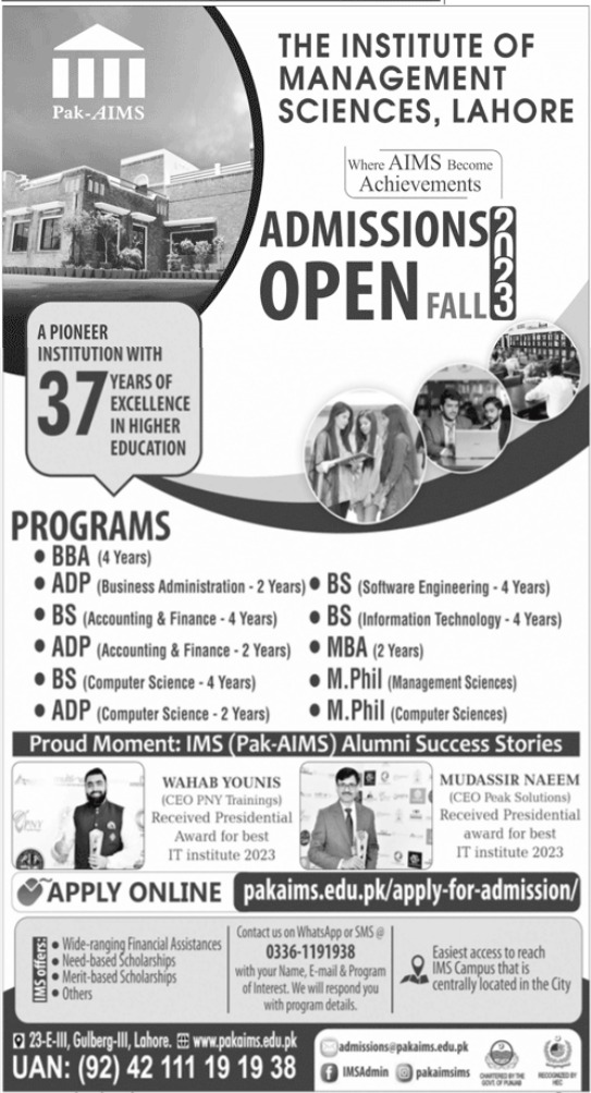 The Institute of management sciences has announced admissions 2023 for ADP, BS, BBA MBA, MPhil. Students can enroll for admissions in The Institute of management sciences Lahore Punjab Pakistan for academic year 2023 to continue campus based or online education in Science University. Students for admissions in BBA, ADP, Mphil, MBA and BS & criteria can apply as per Government institute admission policy 2023 before closing date October 24, 2023 as per advertisement. Read newspaper ad for exact details.