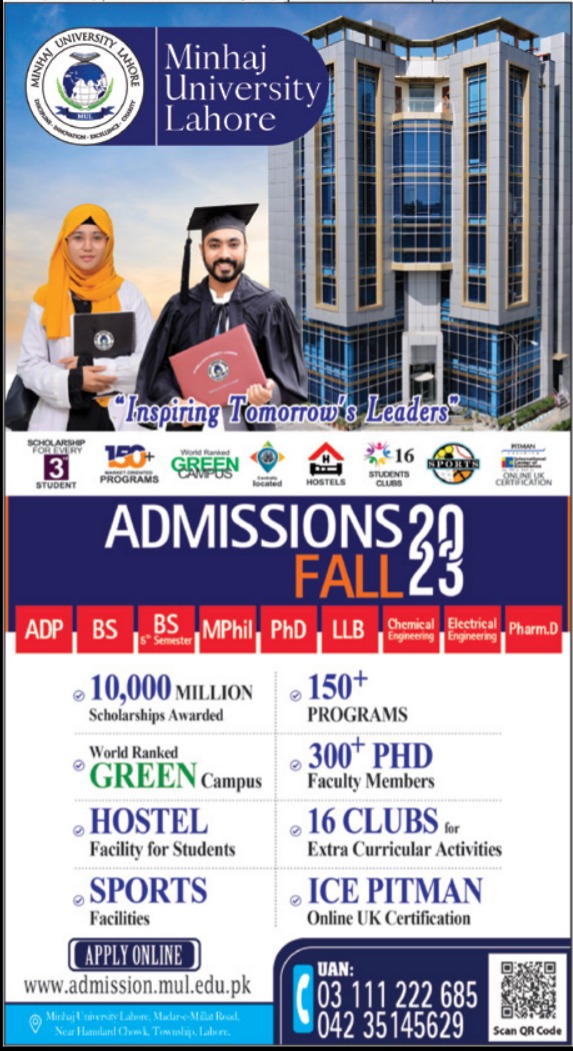 Admissions in Minhaj University Lahore 2023 for ADP Program, BS Program, MPhil Program PhD Program, LLB Program has been announced. Students who want to take admissions in Minhaj University Lahore Lahore Punjab Pakistan for academic year 2023 to continue education in Science University can apply. Students for admissions in BS, Phd, Mphil, ADP and LLb can apply for online or campus classes as per Private institute criteria till admission closing date September 6, 2023. Read newspaper ad for exact details.