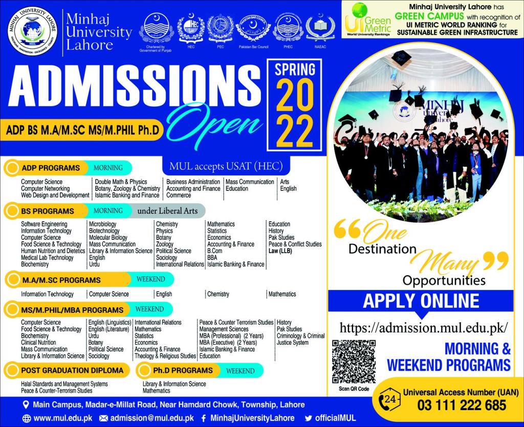 Minhaj University Lahore ADP Programs, BS Programs, MA Programs, MSc Programs, MPhil Programs, PhD Programs admissions 2022 has been started. Eligible students who qualify as per admission criteria in Minhaj University Lahore Lahore Punjab Pakistan can apply in Science University for academic year 2022. Students for admissions in Mphil, Phd, BS, M.sc, ADP and MA & criteria can apply as per Private institute admission policy 2022 before closing date February 22, 2022 as per advertisement. Read newspaper ad for exact details.
