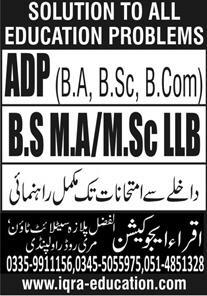 ADP BS MA Msc LLB Admissions 2023 for Iqra Education