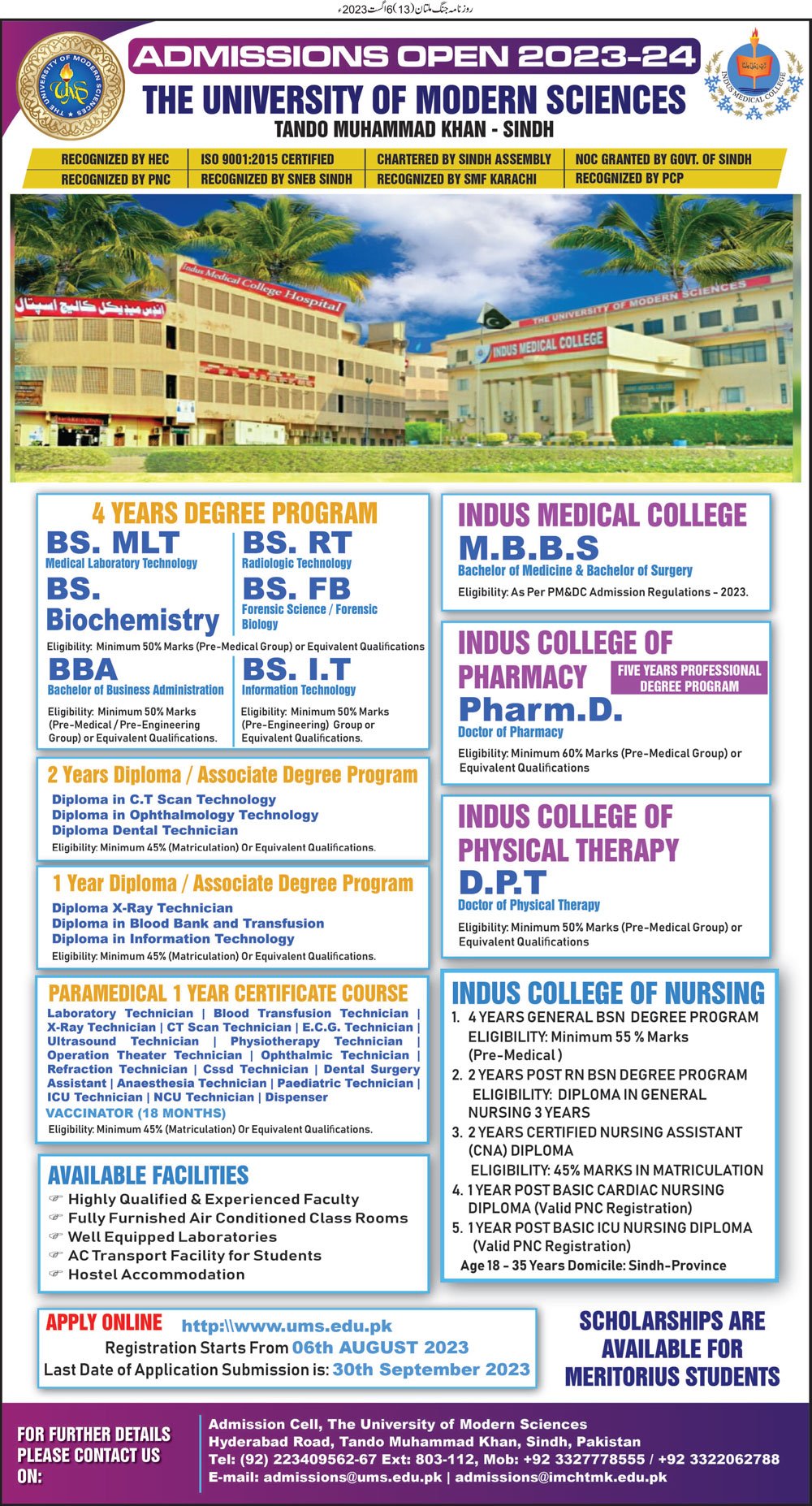 Admissions in The University of Modern Sciences 2023 for ADP Programs, BS Programs, Pharm D, DPT has been announced. Eligible students can apply for academic admissions 2023 in The University of Modern Sciences Tando Muhammad Khan Sindh Pakistan for Science University. Eligible candidates for admissions in BIT, Bachelor, BS, Course, BBA, ADP, Pharm D and DPT can apply as per Private institute criteria and before closing date 30 September 2023 after reading advertisement online. Read newspaper ad for exact details.