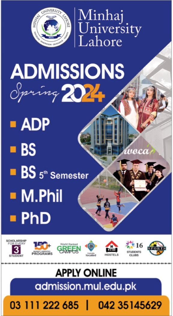 Minhaj University Lahore ADP, BS, MPhil, PhD admissions 2024 has been started. Students who want to take admissions in Minhaj University Lahore Lahore Punjab Pakistan for academic year 2024 to continue education in Science University can apply. Eligible students for fulfilling criteria for admissions in Mphil, BS, Phd and ADP can enroll as per Private admission policy 2024 till closing date 11 March 2024. Read newspaper ad for exact details.