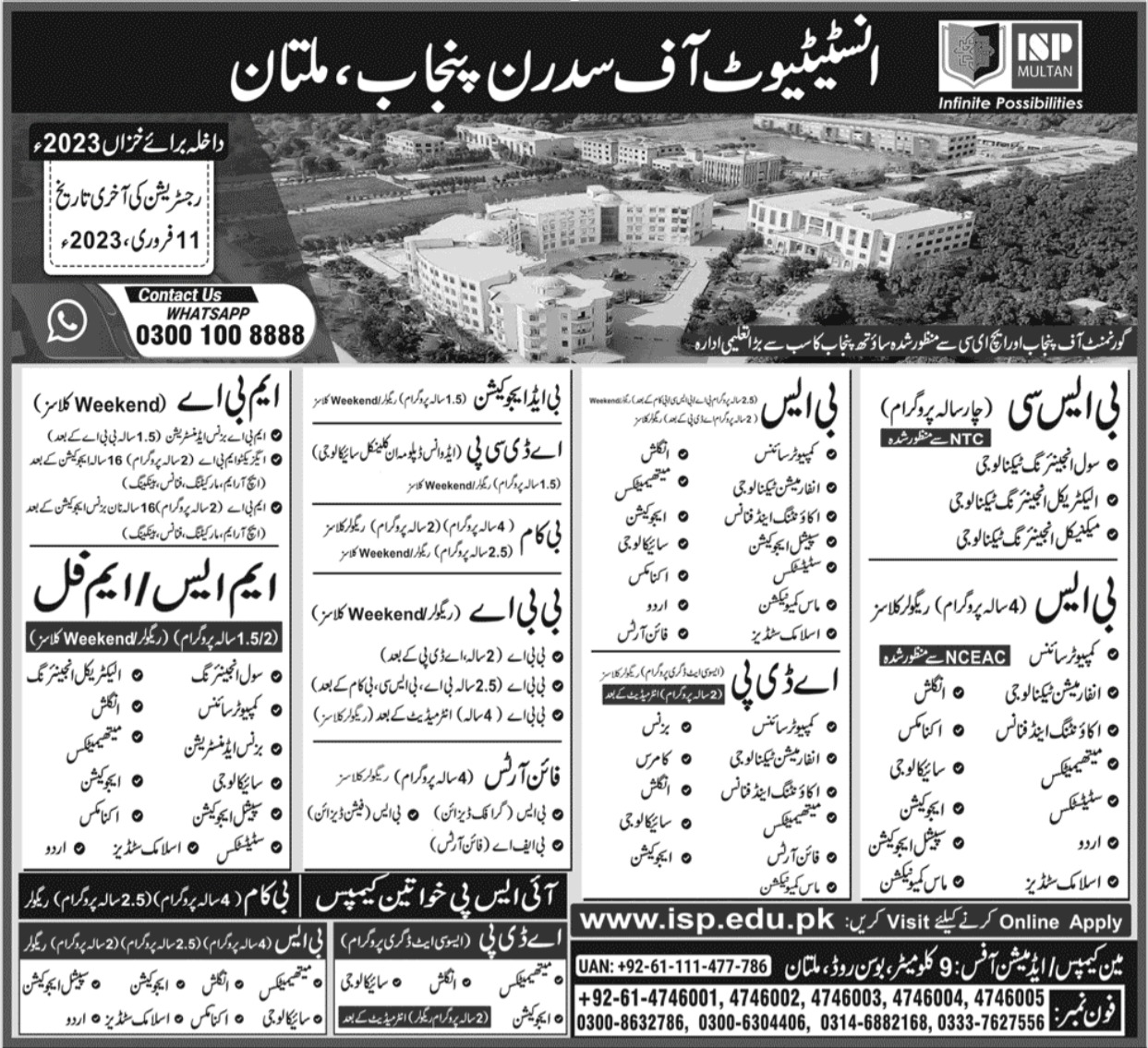 Institute of Southern Punjab ISP BSc Civil Engineering, BSc Electrical Engineering Technology, BSc Mechanical Engineering Technology, BS Computer Science, BS Information Technology, BS Accounting and Finance, BS Mathematics, BS Statistics, BS Urdu, BBA, B.Ed, ADP, MBA, MS, MPhil admissions 2023 has been announced. Eligible students can apply for academic admissions 2023 in Institute of Southern Punjab ISP Multan Punjab Pakistan for Management University. Eligible students for fulfilling criteria for admissions in B.com, MS, ADP, BBA, MBA, B.E, BCS, BS and Mphil can enroll as per Private admission policy 2023 till closing date 11 February 2023. Read newspaper ad for exact details.
