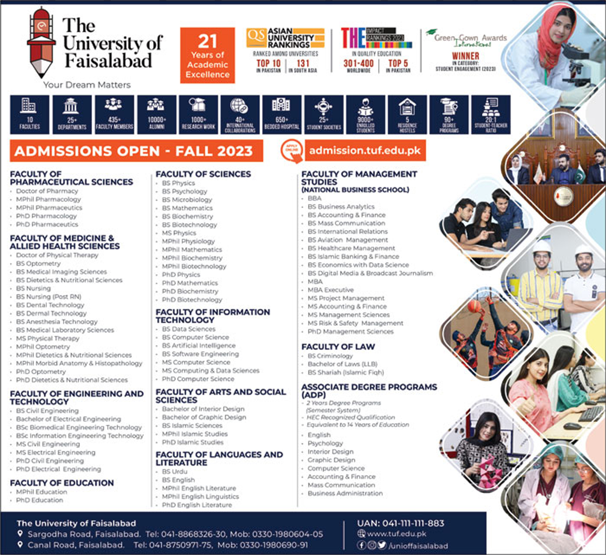 Admissions in The University of Faisalabad 2023 for BS, MS, D Pharm, MPhil, PhD has been announced. Students can enroll for admissions in The University of Faisalabad Faisalabad Punjab Pakistan for academic year 2023 to continue campus based or online education in Science University. Students for admissions in Phd, BS, Mphil, MS and Pharm D can apply for online or campus classes as per Private institute criteria till admission closing date September 13, 2023. Read newspaper ad for exact details.
