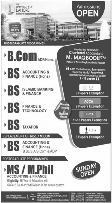 The University of Lahore UOL admissions 2023 for B.Com, BS Accounting and Finance, BS Islamic Banking and Finance, BS Finance and Technology, BS Taxation, BS Accounting and Finance, MS Accounting and Finance, MPhil Accounting and Finance has been announced. Students can enroll for admissions in The University of Lahore UOL Lahore Punjab Pakistan for academic year 2023 to continue campus based or online education in Science University. Eligible candidates for admissions in B.com, ADP, MS, Mphil and BS can apply as per Government institute criteria and before closing date 13 February 2023 after reading advertisement online. Read newspaper ad for exact details.