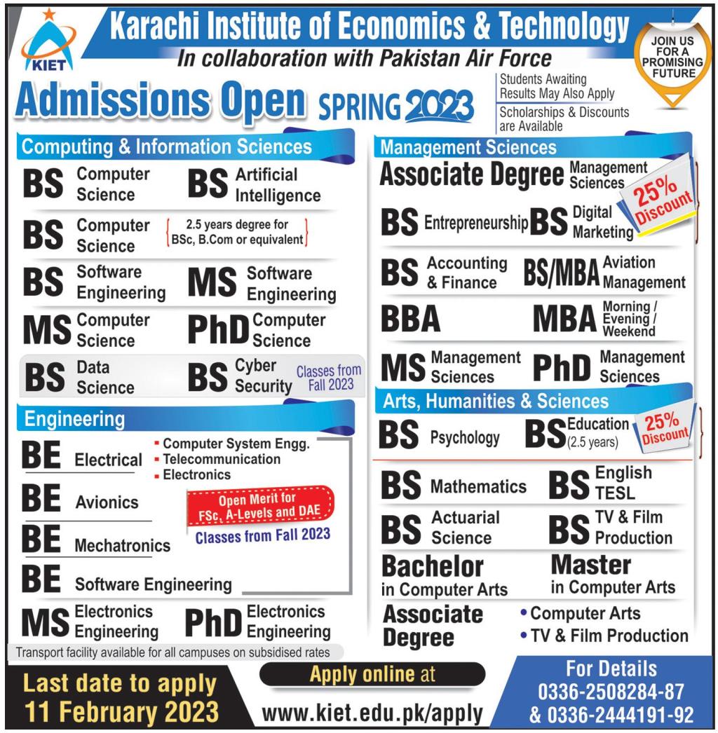 PAF KIET Karachi Institute of Economics & Technology admissions 2023 for Associate Degree in Computer Arts, Associate Degree in TV and Film Production, BS Computer Science, BS Artificial Intelligence, BS Computer Science, BS Software Engineering, MS Computer Science, BE Electrical, BE Avionics, PhD Computer Science, BBA, MBA has been announced. Eligible students who qualify as per admission criteria in PAF KIET Karachi Institute of Economics & Technology Karachi Sindh Pakistan can apply in Science University for academic year 2023. Students for admissions in BCS, BBA, Phd, BS, ADP, MBA and MS & criteria can apply as per Government institute admission policy 2023 before closing date February 11, 2023 as per advertisement. Read newspaper ad for exact details.