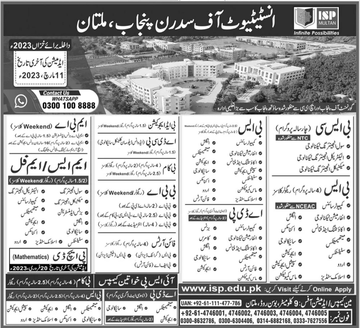 Institute of Southern Punjab ISP ADP Computer Science, ADP Information Technology, ADP Accounting and Finance, ADP Mathematics, ADP Fine Arts, BSc Civil Engineering Technology, BSc Electrical Engineering Technology, BS Mechanical Engineering Technology, BS Computer Science, BS Information Technology, MBA, MS, MPhil, PhD Mathematics admissions 2023 has been announced. Eligible students can apply for academic admissions 2023 in Institute of Southern Punjab ISP Multan Punjab Pakistan for Management University. Students who want to enroll for academic session 2023 in BS, B.ed, B.com, B.E, MS, ADP, BBA, Mphil and MBA qualification and admission criteria for Private institute can apply till last date 11 March 2023. Read newspaper ad for exact details.