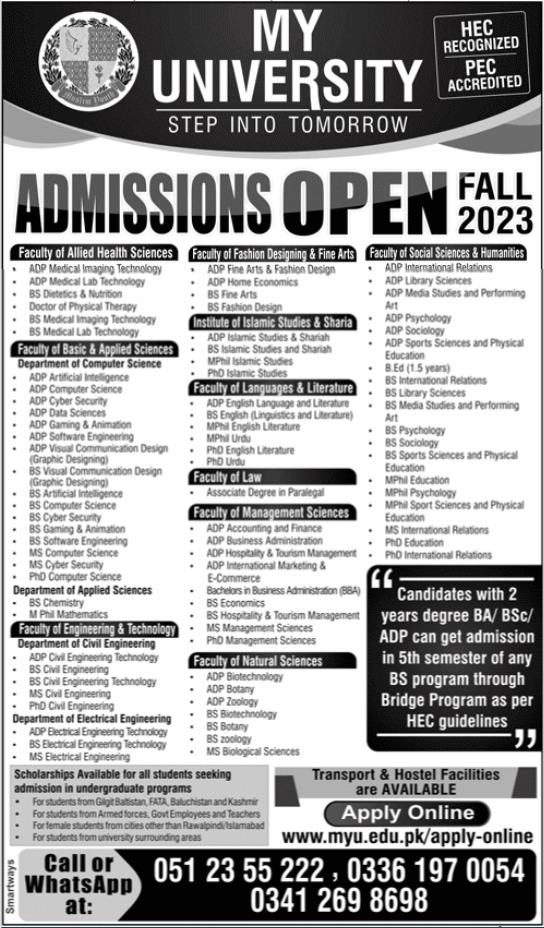 MY University admissions 2023 for ADP, BS, MS, MPhil, PhD has been announced. Eligible students who qualify as per admission criteria in MY University Islamabad Islamabad Pakistan can apply in Science University for academic year 2023. Students for admissions in BS, Phd, MS, Mphil and ADP & criteria can apply as per Private institute admission policy 2023 before closing date August 23, 2023 as per advertisement. Read newspaper ad for exact details.