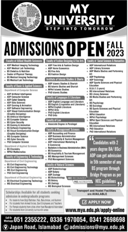 MY University admissions 2023 for ADP, BS, MS, MPhil, PhD has been announced. MY University Islamabad Islamabad Pakistan welcomes students to apply for admissions in academic year 2023 in Science University. Students who want to enroll for academic session 2023 in MS, BS, Phd, Mphil and ADP qualification and admission criteria for Private institute can apply till last date 3 October 2023. Read newspaper ad for exact details.