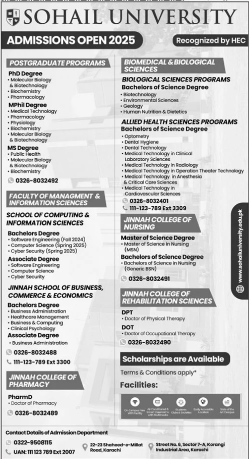 Sohail University ADP, BS, MS, MPhil, PhD admissions 2024 has been started. Students can enroll for admissions in Sohail University Karachi Sindh Pakistan for academic year 2024 to continue campus based or online education in Science University. Students for admissions in ADP, BSN, Phd, DPT, MS, BS and Mphil can apply for online or campus classes as per Private institute criteria till admission closing date September 30, 2024. Read newspaper ad for exact details.