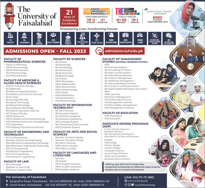 The University of Faisalabad ADP, BS, MS, MPhil, PhD admissions 2023 has been announced. The University of Faisalabad Faisalabad Punjab Pakistan welcomes students to apply for admissions in academic year 2023 in Science University. Students for admissions in MS, Phd, ADP, BS and Mphil & criteria can apply as per Private institute admission policy 2023 before closing date November 10, 2023 as per advertisement. Read newspaper ad for exact details.