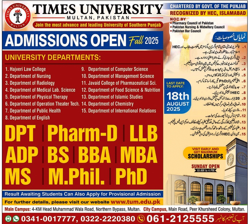ADP, PHARM-D, LLB, BS, BBA, MBA, MS, MPHIL, PHD Admissions 2025 open in Times