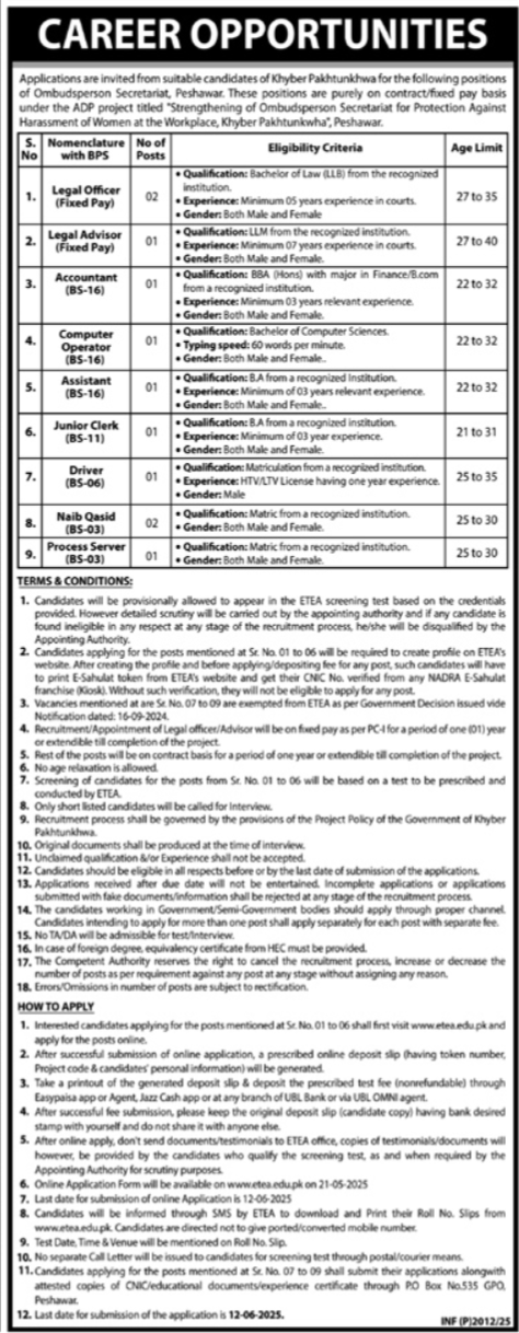 ADP Project invites applications for job positions advertised in daily Mashriq dated 19 May 2025 for following vacancies in Peshawar, peshawar Khyber Pakhtunkhwa KPK Pakistan.