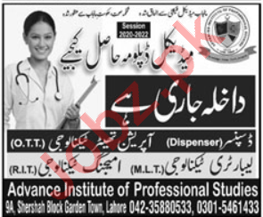 Advance Institute of Professional Studies AIPS Lahore, Pakistan is starting admissions fall 2020 for the classes of Diploma in Medical Lab Technology, OT Technology, Dispenser. Read newspaper ad for exact details.