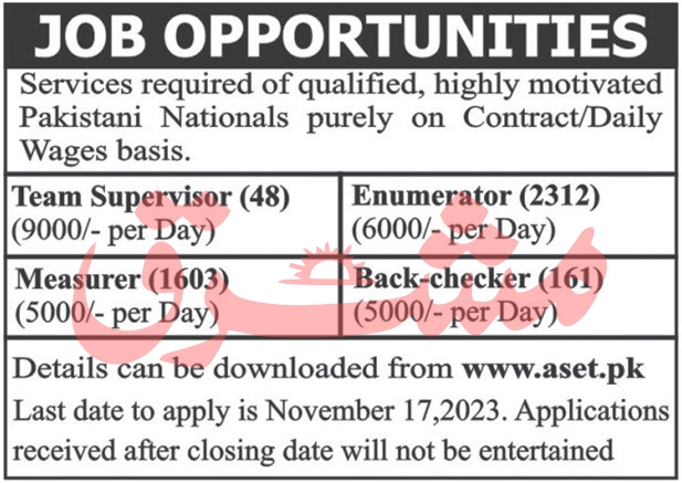 Advancement in Sustainable Education and Transformation ASET invites applications for job positions advertised in daily Mashriq dated 9 November 2023 for following vacancies in Peshawar, peshawar Khyber Pakhtunkhwa KPK Pakistan.