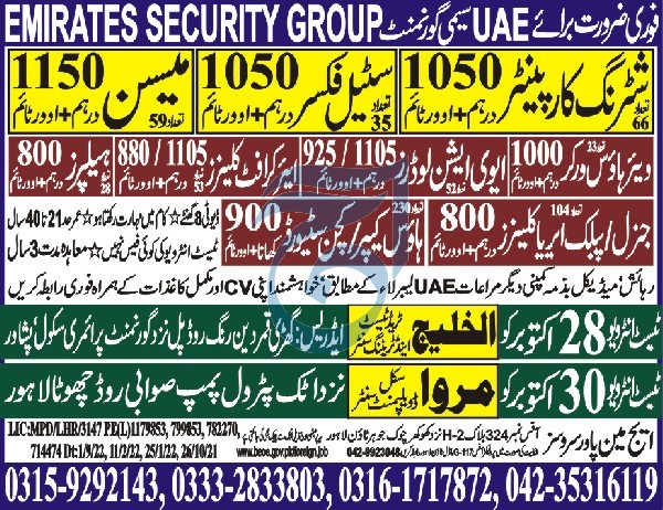 Vacant posts including kitchen steward, aviation loader, ware house worker, helper, steel fixer, shuttering carpenter, mason, public area cleaner and air craft cleaner are announced in Al Khaleej Trade & Training Center Abu Dhabi, abu dhabi UAE as per 25 October 2022 advertisement in daily Aaj Newspaper. Persons with Intermediate, Matric and Middle etc. education can apply.