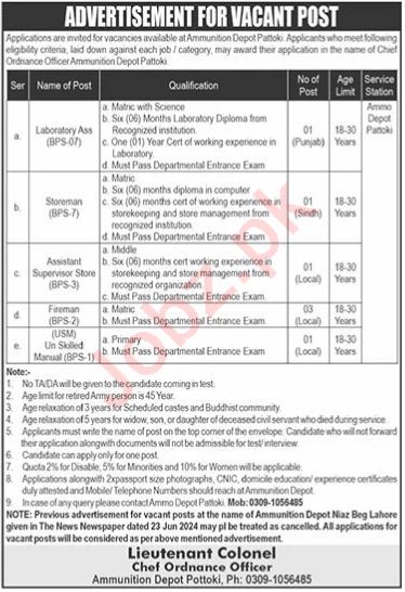 Ammunition Depot jobs advertisement dated about 30 June 2024 in daily The News Newspaper invites application for the vacant post of assistant supervisor store, fireman, storeman, laboratory assistant and usm unskilled manual in Pattoki, pattoki Punjab Pakistan. Middle, Matric and Primary etc. educational qualification will be preferred.