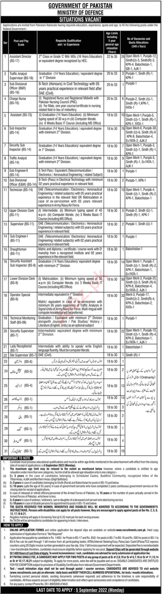 Ministry of Defence Lahore, quetta, rawalpindi, lahore, north waziristan, karachi, islamabad, peshawar and south waziristan Punjab Pakistan invites applications from eligible candidates for the post of cook, sub engineer ii, lascar, driver, sub divisional officer, lady receptionist, lower division clerk, assistant, draughtsman, sub inspector, naib qasid, supervisor, mali, mess waiter, technical monitoring staff, security supervisor, assistant director, traffic analyst supervisor, site supervisor, security assistant, sub engineer, upper division clerk, charge nurse, sub divisional officer e m, traffic analyst, technician, security sub inspector, operator special, sanitary worker, special staff and water man as per advertisement of August 21, 2022 published in daily Jang Newspaper. Candidates with Matric, Bachelor, MA, Primary, DAE, Middle, Intermediate, B.E and M.sc etc. educational background will be preferred.