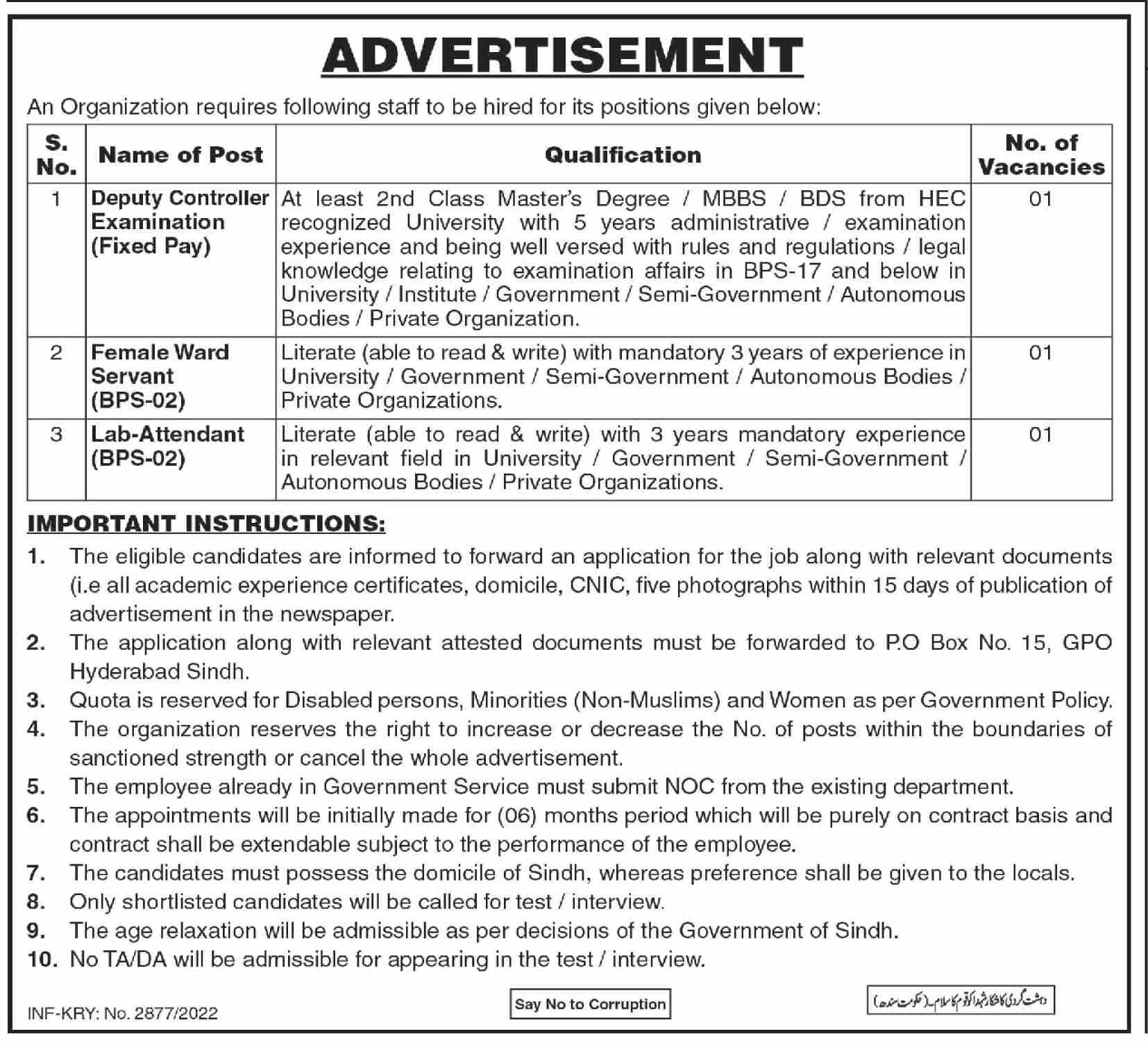 Vacant posts including lab attendant, female ward servant and deputy controller examination are announced in Private Organization Hyderabad, hyderabad Sindh Pakistan as per 23 June 2022 advertisement in daily Dawn Newspaper. Primary, MBBS, BDS and Master etc. educational qualification will be preferred.
