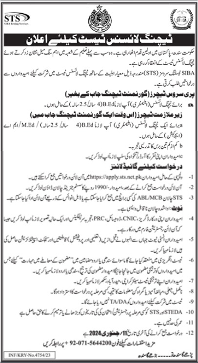 Siba Testing Service STS Sukkur, sukkur Sindh Pakistan invites applications from eligible candidates for the post of teaching license test as per advertisement of December 23, 2023 published in daily Jang Newspaper. Preferred Education is B.ed and Bachelor etc.