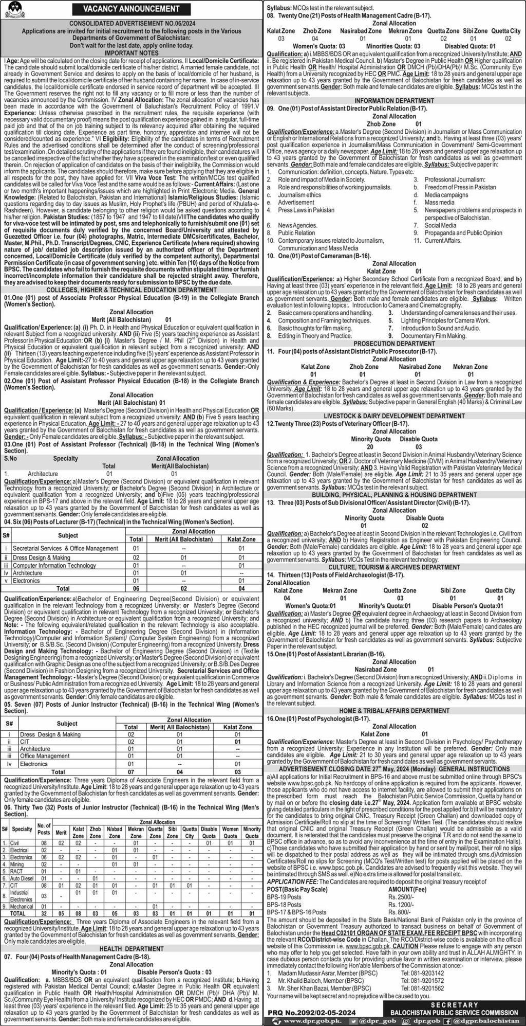 BPSC Balochistan Public Service Commission Quetta, quetta Balochistan Pakistan invites applications from eligible candidates for the post of instructor technical, instructor cit, instructor ract, lecturer, veterinary officer, associate professor physical education, psychologist, instructor electronics, instructor electrical, assistant director, instructor auto diesel, assistant professor physical education, field archaeologist, assistant district public prosecutor, assistant professor, assistant professor technical, assistant director public relation, instructor mechanical, health management cadre, assistant librarian, sub divisional officer, instructor, instructor industrial electronics, instructor civil, lecturer technical, associate professor, camera man and instructor mining as per advertisement of May 3, 2024 published in daily Express Newspaper. Educational qualifications required DAE, MBBS, Bachelor, BDS, Phd, B.E, Master and Intermediate etc.