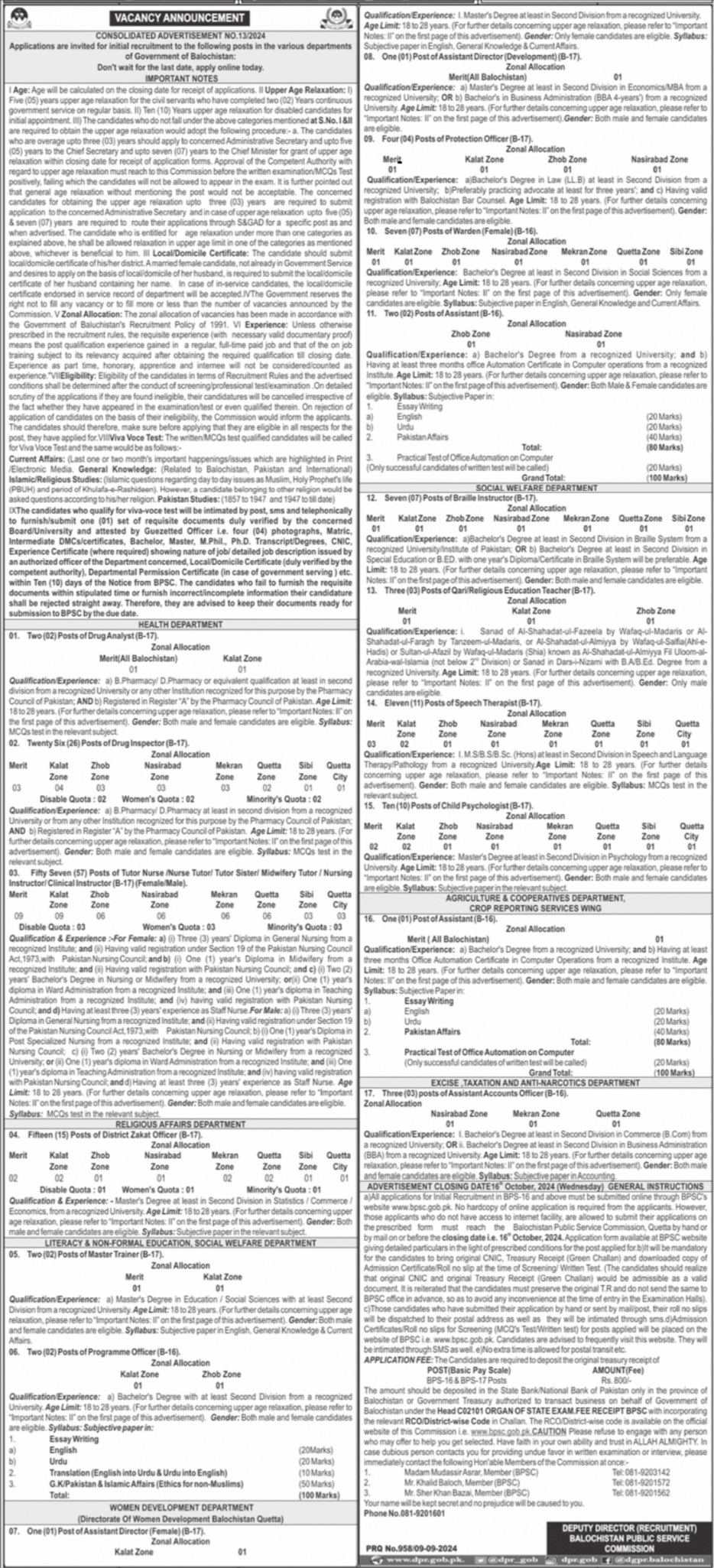 BPSC Balochistan Public Service Commission jobs advertisement dated about 10 September 2024 in daily Jang Newspaper invites application for the vacant post of nursing instructor, speech therapist, tutor nurse, tutor sister, warden, braillie instructor, clinical instructor, drug inspector, religious education teacher, district zakat officer, assistant accounts officer, master trainer, child psychologist, assistant, drug analyst, assistant director development, female assistant director, protection officer, nurse tutor, qari, programme officer and midwifery tutor in Quetta, kalat, naseerabad, makran, zhob, quetta and sibi Balochistan Pakistan. Candidates with B Pharmacy, Bachelor, Intermediate, LLb, Pharma D, MS and Master etc. educational background will be preferred.