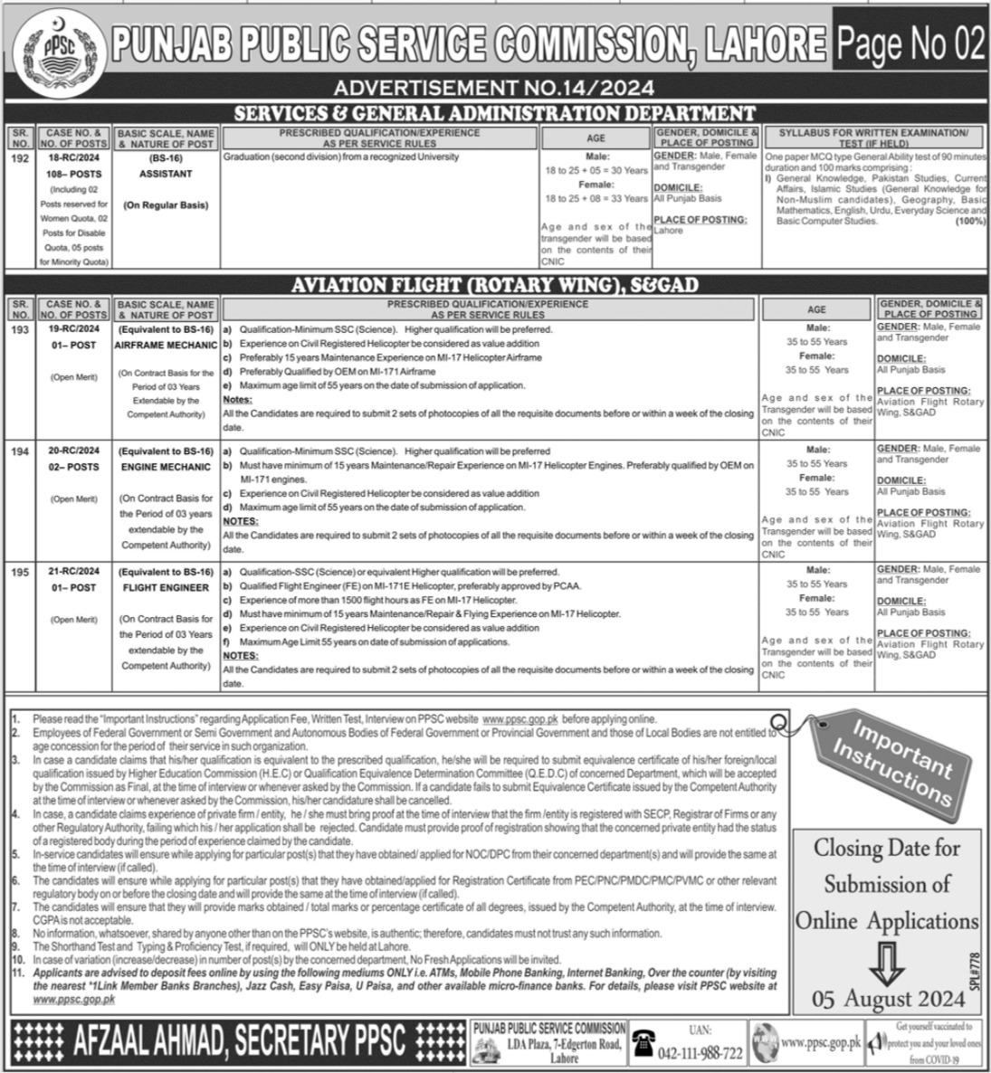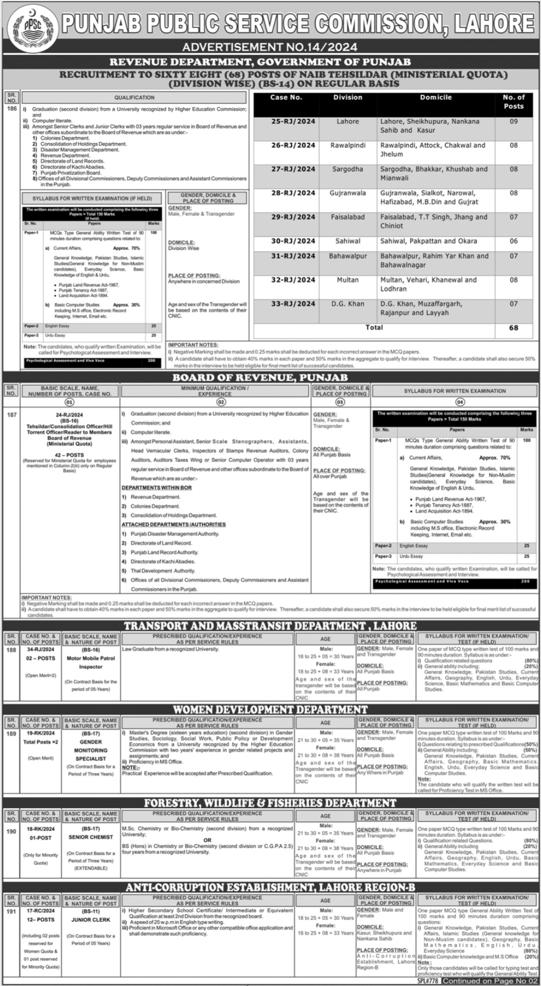 Vacant posts including engine mechanic, motor mobile patrol inspector, flight engineer, consolidation officer, gender monitoring specialist, hill torrent officer, naib thesildar, clerk, assistant, chemist, airframe mechanic and reader are announced in Punjab Public Service Commission PPSC Lahore, lahore Punjab Pakistan as per 19 July 2024 advertisement in daily Jang Newspaper. Matric, LLb, Bachelor, Intermediate, M.sc and Master etc. educational qualification will be preferred.