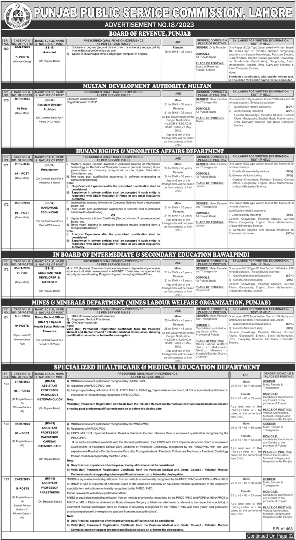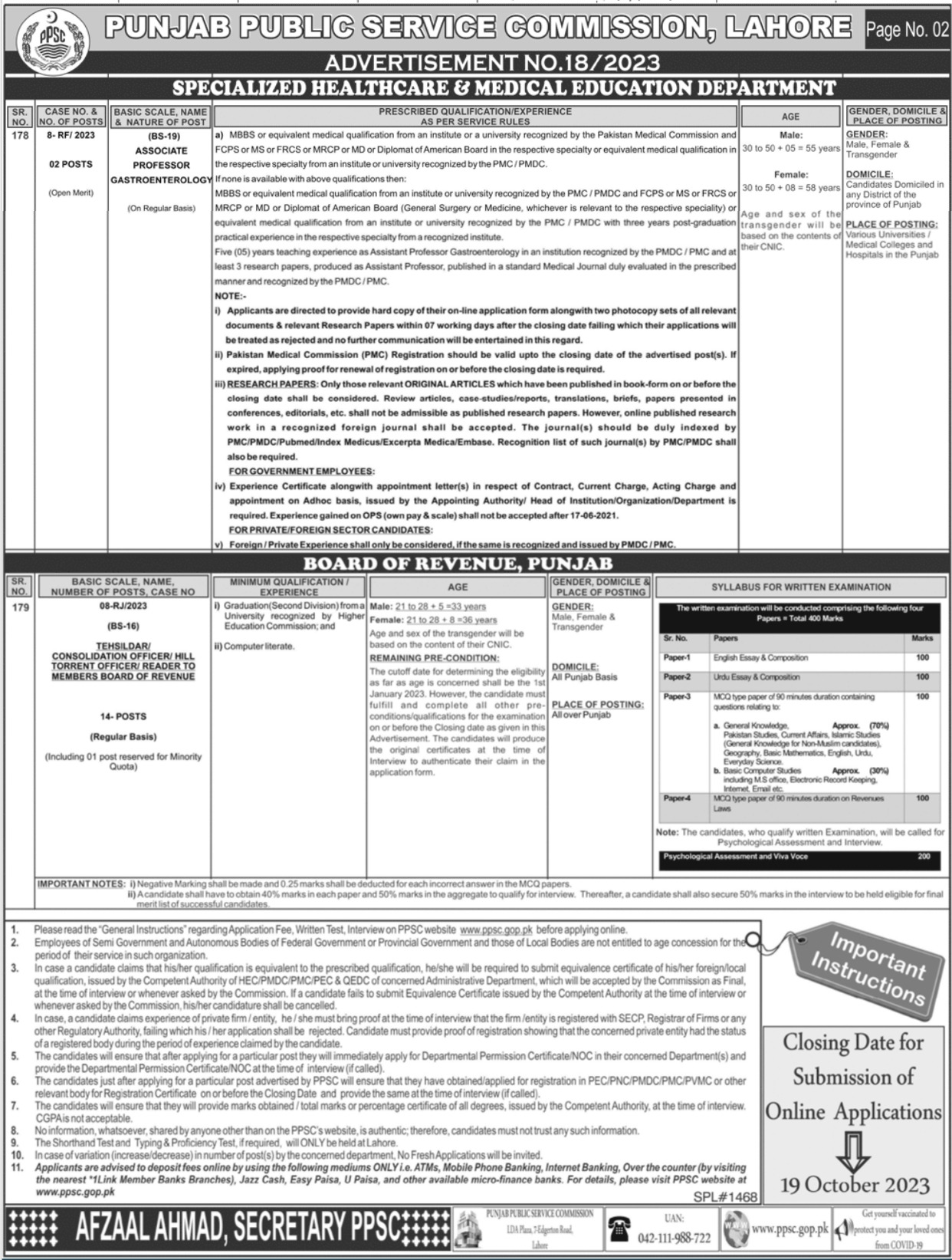 Punjab Public Service Commission PPSC Lahore, lahore Punjab Pakistan invites applications from eligible candidates for the post of assistant professor paediatric cardiac intensive care, associate professor gastroenterology, assistant professor histopathology, assistant professor anaesthesia, hardware technician, assistant professor pathology, mines medical officer, programmer, consolidation officer, hill torrent officer, reader, assistant, assistant director architect, tehsildar and assistant web developer manager as per advertisement of October 4, 2023 published in daily Jang Newspaper. Bachelor, Intermediate, MCS, M.sc, MBBS, MS and Master etc. educational qualification will be preferred.