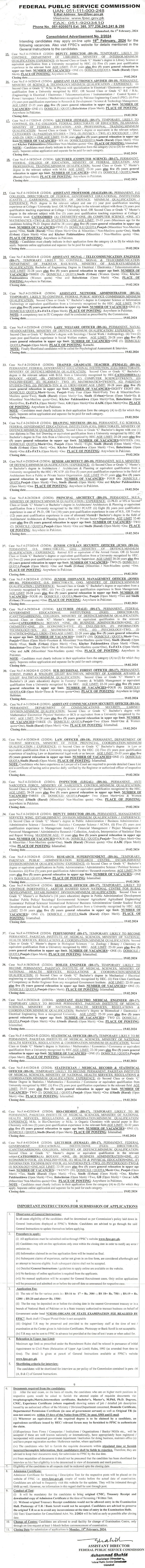 Federal Public Service Commission FPSC jobs advertisement dated about 3 February 2024 in daily Other Newspaper invites application for the vacant post of inspector, statistical officer, law officer, assistant electro medical engineer, male lecturer, assistant communication security officer, research superintendent, principal architect, statistician officer, female lecturer, drawing mistress, perfusionist, architect, assistant electronics adviser, bio chemist, boiler engineer, ordnance management officer jomo, lady welfare officer, assistant network administrator, assistant signal engineer, female trained graduate teacher, medical record statistical officer, sub divisional forest officer, telecommunication engineer, lecturer computer science, research officer, male assistant professor, deputy director and civilian security officer jcso in Islamabad, islamabad Islamabad Pakistan. Persons with Phd, M.sc, LLb, B.E, ACCA, B.ed, MS, BCS, Bachelor, BIT, Mphil, Master and MBA etc. education can apply.
