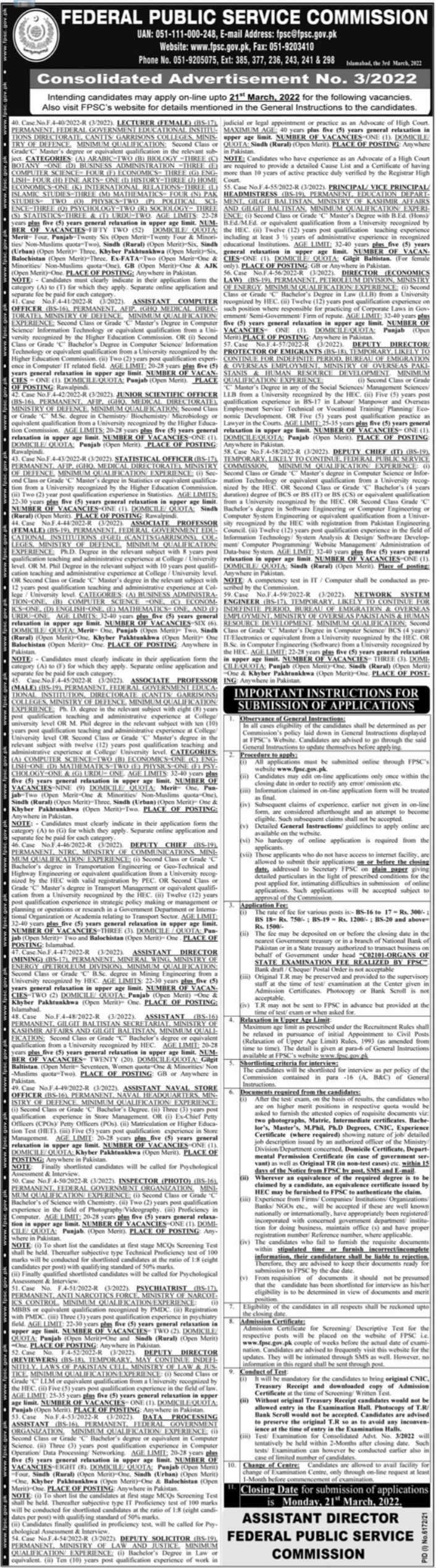 Latest Government jobs in Federal Public Service Commission FPSC in Management and others can be applied till 21 March 2022 or as per closing date in newspaper ad. Read complete ad online to know how to apply on latest Federal Public Service Commission FPSC job opportunities.