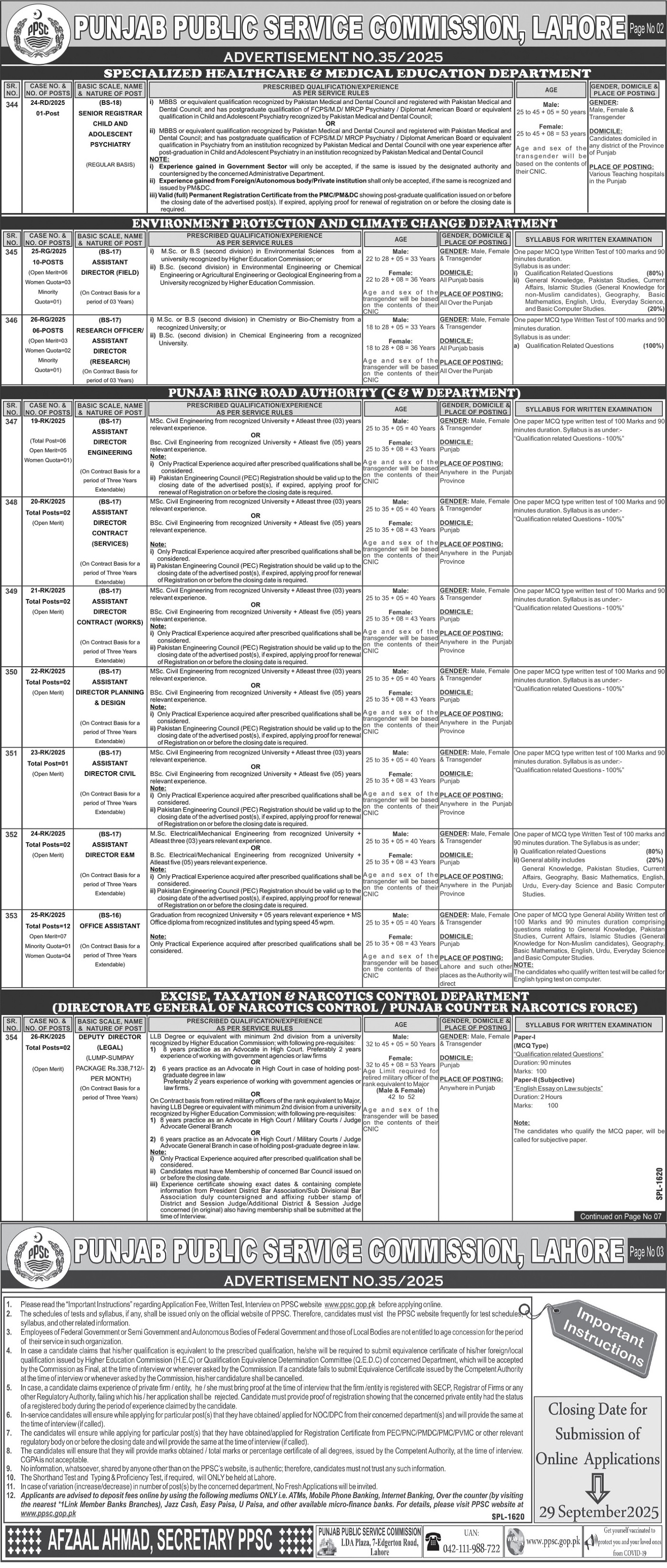 Specialized Healthcare & Medical Education Department, Environment Protection & Climate Change Department, Punjab Ring Road Authority, Communication & Works Department, Excise Taxation & Narcotics Control Department, Directorate Generator of Narcotics Control, Punjab Counter Narcotics Force, Punjab Public Service Commission PPSC invites applications for job positions advertised in daily Express Tribune dated 12 September 2025 for following vacancies in Egerton Road Lahore, lahore Punjab Pakistan.