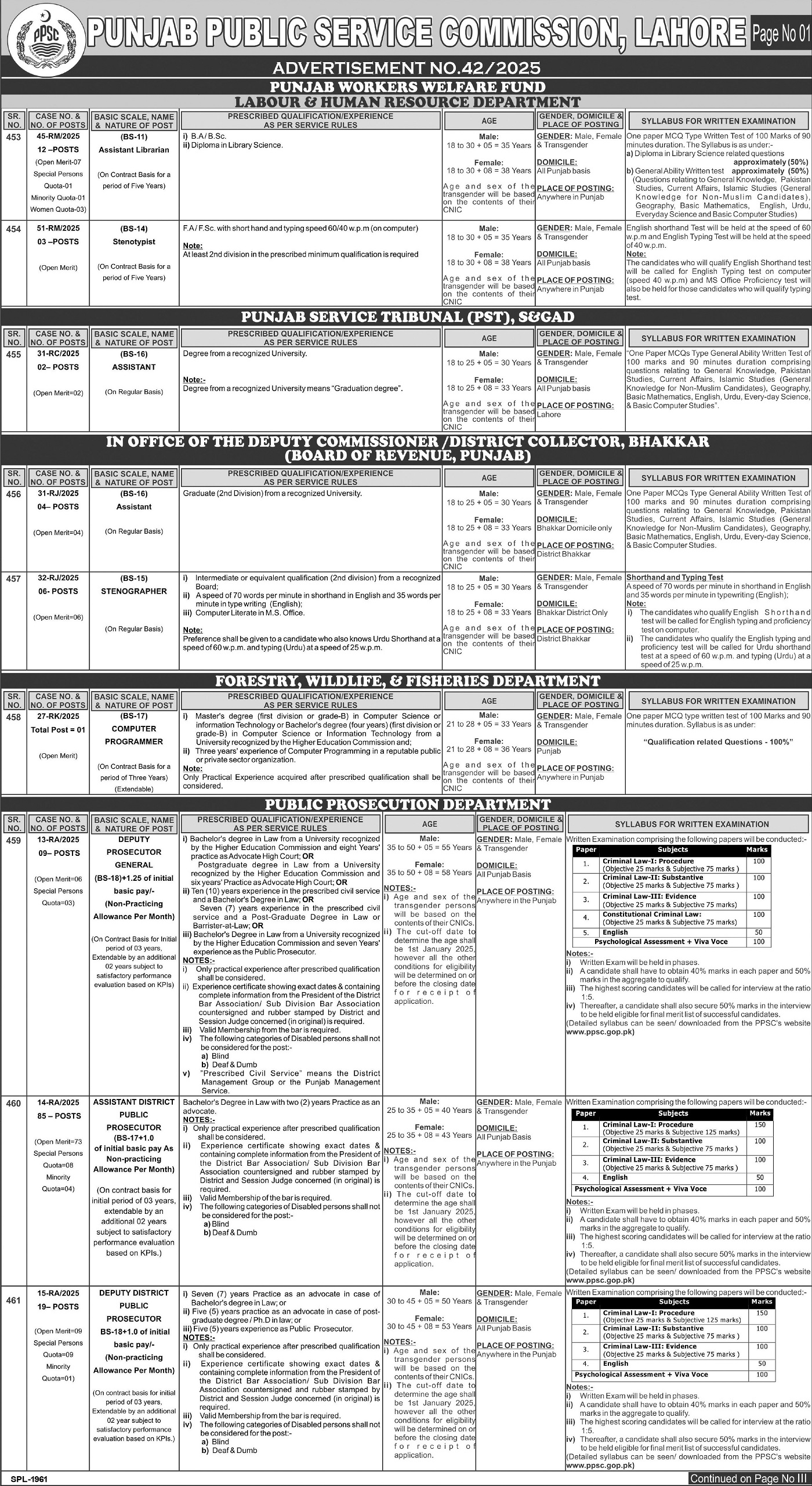Punjab Workers Welfare Fund, Labour & Human Resource Department, Punjab Service Tribunal, Services & General Administration Department, Deputy Commissioner Office, District Collector, Board of Revenue BOR, Forestry Wildlife & Fisheries Department, Punjab Prosecution Department, Specialized Healthcare & Medical Education Department, Punjab Public Service Commission PPSC invites applications for job positions advertised in daily Express Tribune dated 6 November 2025 for following vacancies in Egerton Road Lahore, lahore Punjab Pakistan.