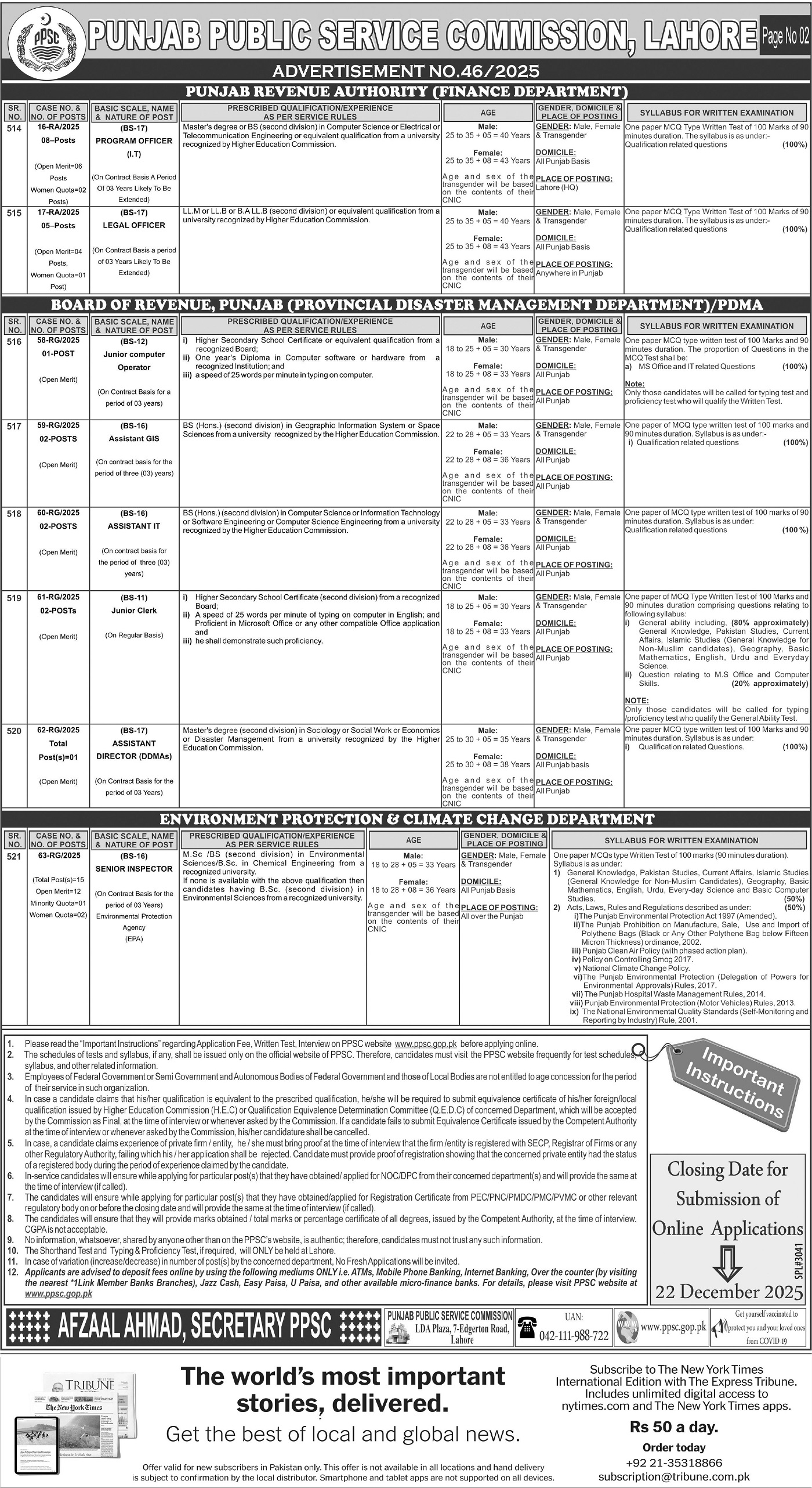 Specialized Healthcare & Medical Education Department, Bureau of Statistics, Planning & Development Board, Revenue Department, Deputy Commissioner DC, Board of Revenue BOR, Local Government & Community Development Department, Mines & Minerals Department, Mines Labour Welfare Commissionerate, Children Library Complex, school Education Department, Punjab Revenue Authority PRA, Finance Department, Provincial Disaster Management Authority PDMA, Environment Protection & Climate Change Department, Punjab Public Service Commission PPSC jobs advertisement dated about 5 December 2025 in daily Express Tribune Newspaper invites application for the vacant post of sub specialist english, assistant professor ent, subject specialist physics, assistant engineer, legal officer, program officer it, assistant gis, stenographer, computer operator, assistant director, program officer, subject specialist islamic studies, audit officer, clerk, assistant professor, associate professor, subject specialist, statistical officer, assistant it, associate professor critical care, inspector and associate professor icu in Egerton Road Lahore, lahore Punjab Pakistan. Persons with M.sc, Bachelor, M.com, B.ed, DAE, Intermediate, Others, MBA, MA, M.ed, MBBS, Master and MS etc. education can apply.